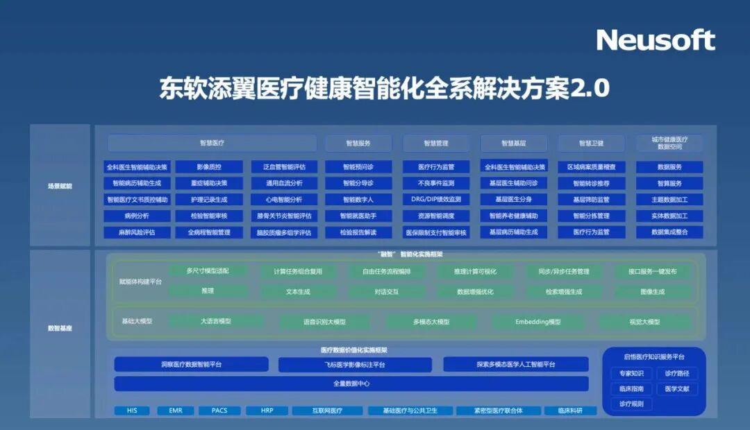 事实上,过去数十年来,从系统集成到解决方案,再到今天的帮助医疗机构甚至是地方政府共建智慧服务平台,东软在解决方案智能化、数据价值化等方面已经取得不少的进展——自研了洞察医疗数据智能平台、 飞标医学影像标注平台探索多模态医学人工智能平台,智能病历生成、AI-CDSS疾病知识库产品、基于大模型的医保智能数据查询分析应用等;推出数据价值化平台、数字人社智能指挥系统等,并与多地政府达成智慧医疗、智慧城市等服务模式。