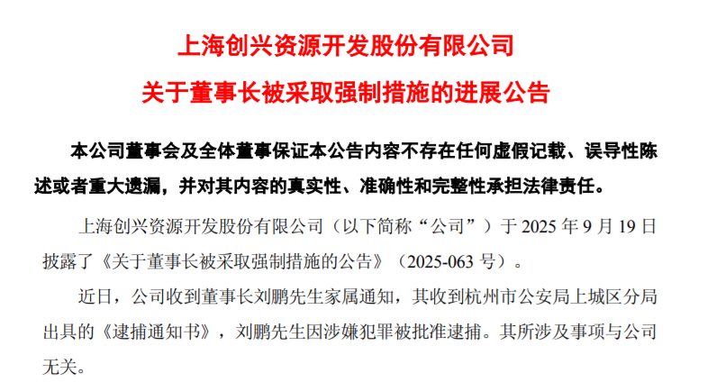 10月31日,据*ST创兴(600193.SH)公告,公司董事长刘鹏因涉嫌犯罪,被杭州市公安局上城区分局批准逮捕。