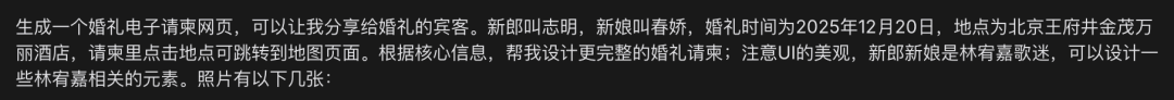 如果只是为了实用,还有一种更简单的办法:写死!写死!通通写死在代码里!与其做一个功能复杂的请柬生成器,再用它生成一张电子请柬,不如直接把信息告诉G老师,让它直接写一个可分享的请柬网页。于是提示词修改如下: