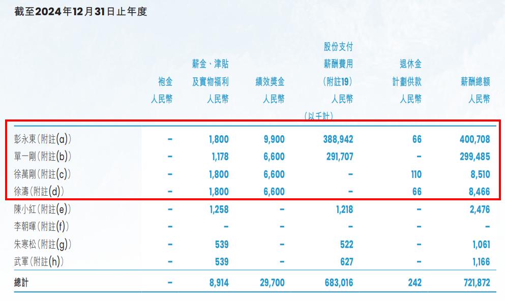 2024年:彭永东的薪酬为4.01亿元,单一刚的薪酬2.99亿元,徐万刚的薪酬为851万元,徐涛的薪酬为846.6万元。